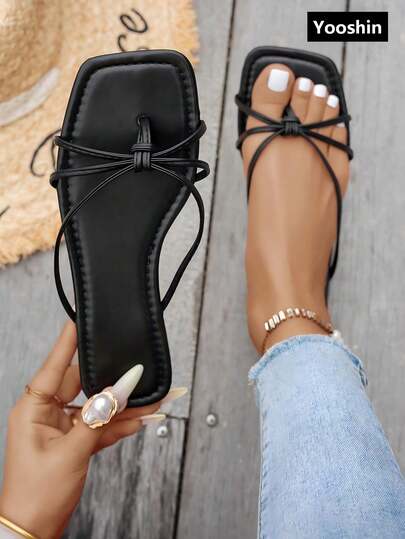 女士平底方头凉鞋,简约时尚,套脚设计,交叉绑带人字拖,波西米亚风沙滩拖鞋