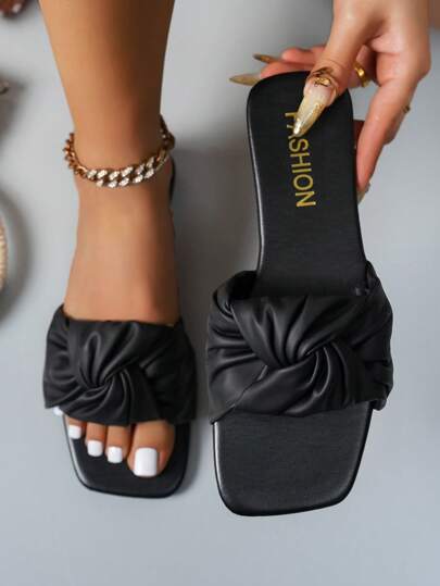 女士手工荷叶边玫瑰设计系带凉鞋,漂亮时尚的鞋面,箔印花鞋底,休闲方形露趾平底夏季鞋,轻便拖鞋 - 黑色 - 查看 1