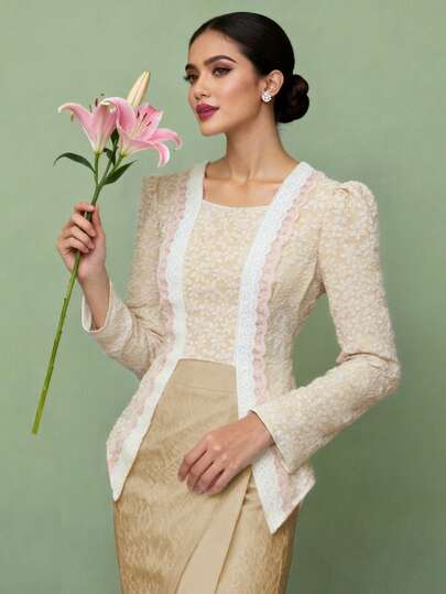 Kobayashi 女士 - 提花优雅提花蕾丝拼接长袖衬衫 - 白色 - 查看 1