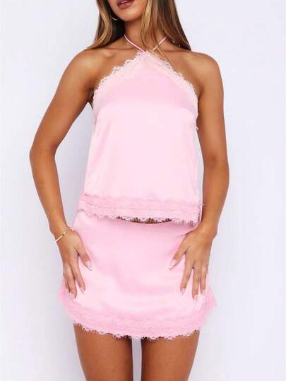 Women's Lace Trim Two Piece Outfit Halter Neck Sleeveless Crop Top Mini Skirt Set For Summer Casual Wear