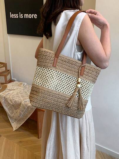 女士大容量托特包时尚流苏沙滩单肩包手提包,适合旅行、日常购物 - 卡其色 - 查看 1