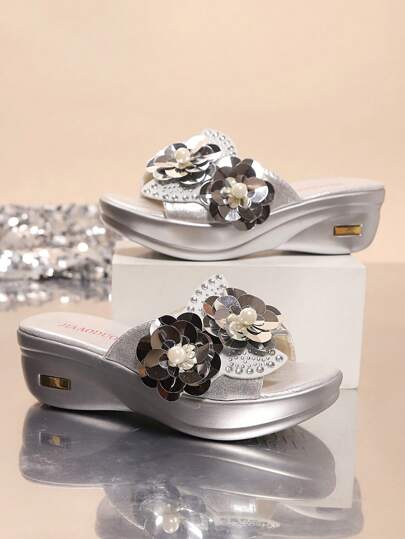 女士新款时尚百搭厚底坡跟凉鞋,花卉装饰,简约优雅纯色,舒适材质,套穿式,防水厚底,金色/银色可选,适合外出、派对、休闲、性感等场合。