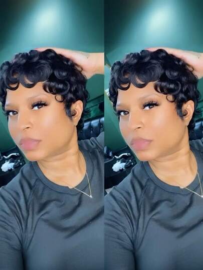 女士精灵短假发,真人发卷发假发,1B黑色,99J,4号棕色短假发,真人发层次假发,无胶假发,无蕾丝前额,全机织层次假发,带刘海精灵短假发,易于佩戴,是送给爱人的理想礼物,适合情人节或日常使用。 - 彩色 - 查看 11