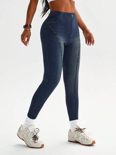 女士印花牛仔效果高腰修身休闲打底裤 - 藏蓝色 - 查看 1