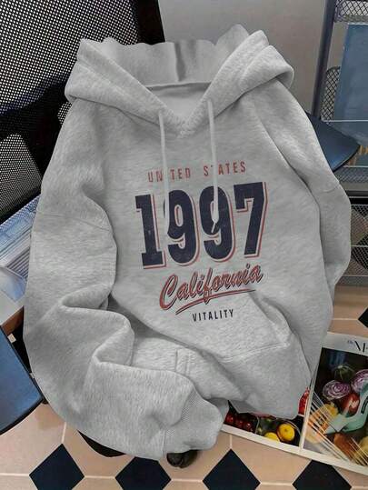 女士复古风连帽卫衣,饰有1997年加州图案和字母印花,休闲美式风格,舒适百搭,时尚秋冬女装,适合日常穿着和通勤。抽绳连帽套头衫,秋冬必备。 - 灰色 - 查看 1