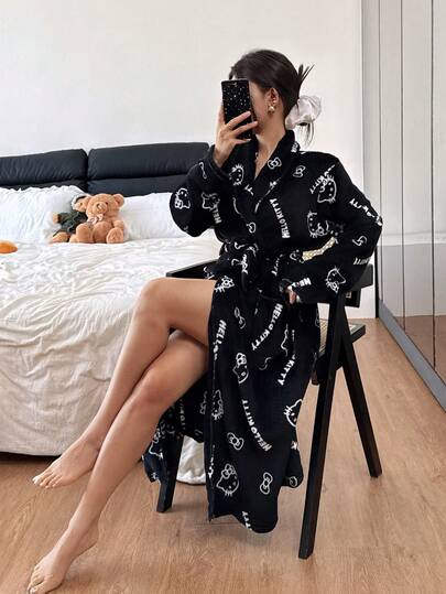 女士睡衣,可爱猫咪印花柔软长袖睡衣,毛绒浴袍家居服,保暖冬季家居服,黑色 - 黑色 - 查看 7
