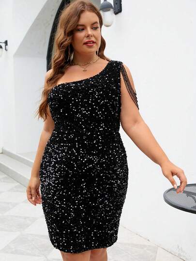 女式闪亮亮片拼布扭纹前拉链派对连衣裙 - 黑色 - 查看 1