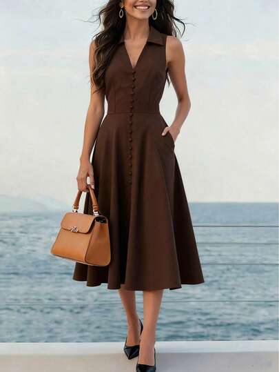 女士春夏法式优雅连衣裙,简约时尚,复古风格,职业办公装,无袖V领修身A字连衣裙,单排扣侧袋,中长裙