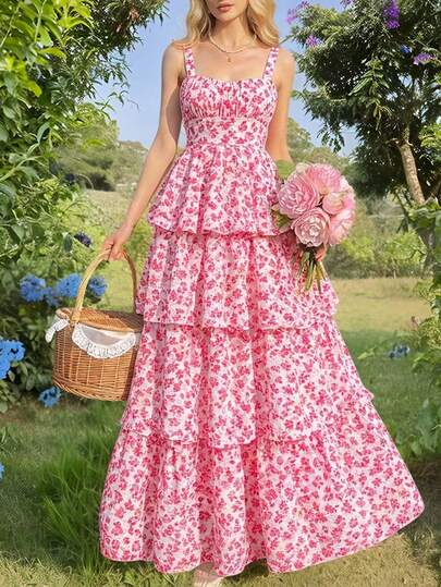 女士夏季休闲度假印花褶皱胸部荷叶边下摆连衣裙 优雅粉色