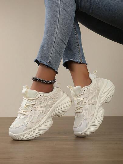 女士厚底厚底运动鞋,透气网眼增高休闲轻便运动鞋和百搭厚底乐福鞋 - 米色 - 查看 1
