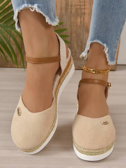 女性坡跟跟鞋帶金屬質感裝飾用品和編織踝帶 - 米色 - 查看 1