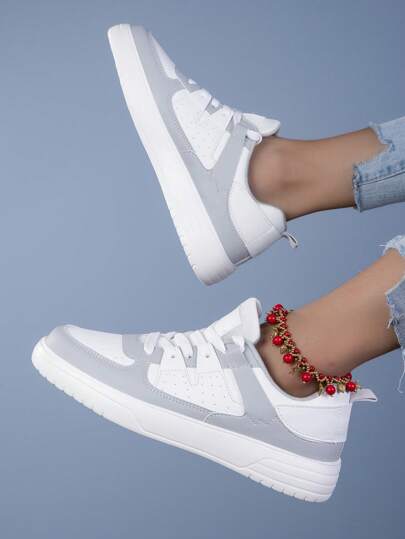 Women's White & Grey Athletic Sneakers, Classic Round Toe Lace-Up Party Shoes, Thick Sole Cushioned Comfortable Skateboarding Shoes, Holiday & Birthday Gift, Student Shoes