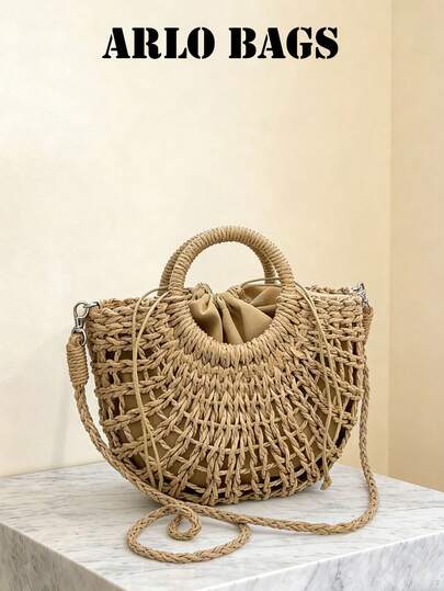 女士编织草编手提包,配有顶部提手、可拆卸斜挎肩带、镂空抽绳设计,是一款多功能顶部提手斜挎包,夏季沙滩篮式手提包,带内衬,是度假、海滩、日常出行的理想之选。