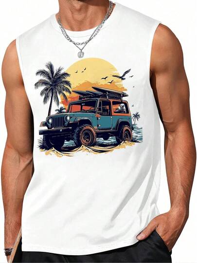 1pcs Stylish Men's Tank Top With Unique Sunset  And Surfboards Graphic Print Vest, Perfect For Summer Beach Vacation, Ideal For Surfing Enthusiasts, Is A Great Gift ChoiceEthnic Style Pure Cotton Printed T-Shirt Suitable For Casual Outings - 白色 - 查看 1