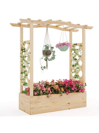 Wooden Raised Garden Bed W/ Trellis & Hanging Roof Planter Box Drainage System