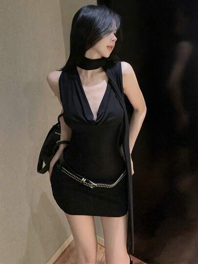 Y2K 美国坏女孩紧身黑色垂褶露背连衣裙,夏季性感铆钉腰带收腰黑色连衣裙 - 黑色 - 查看 1
