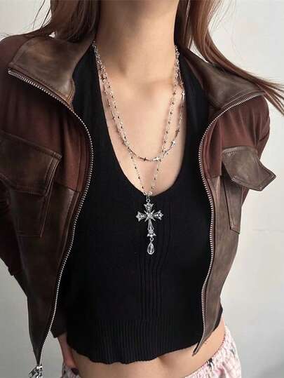 Y2K 多层串珠十字架项链,朋克哥特风复古颈链 - 十字架水滴項鍊 - 查看 1