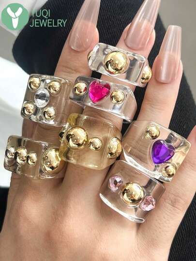 Y2K透明树脂戒指,宽版金属珠心形水钻戒指,朋克风叠戴戒指