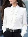 女士优雅长袖衬衫,黑色领口饰有荷叶边和蝴蝶结,常规版型,适合工作、春季、秋季和冬季穿着。