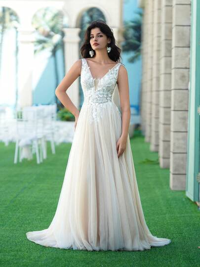 YOUKEFEIER 优雅V领蕾丝串珠香槟色长款婚纱 - 杏色 - 查看 1