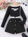 女童优雅蝴蝶结领长袖连衣裙,适合秋季休闲日常穿着