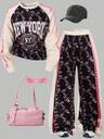 Tween Girl 字母图案撞色运动校园风棒球夹克和百褶迷你裙休闲套装