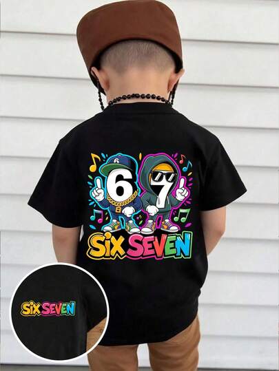 男童休闲时尚创意个性清新简约酷炫数字67卡通人物音乐符号图案字母标语印花基础款短袖T恤,舒适日常穿着,适合春、夏、秋季穿着。 - 黑色 - 查看 6