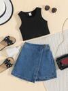 SHEIN 少女鏈條針織背心頂和牛仔短裙套裝,夏季款