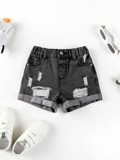 SHEIN 年轻女孩休闲百搭阔腿宽松破洞翻边牛仔短裤 - 黑色 - 查看 1