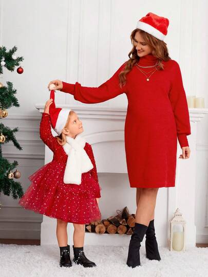 SHEIN 女小童1入組亮片拼接網紗覆蓋洋裝帶圍巾適用於聖誕 - 紅色 - 查看 1
