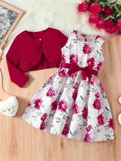 年轻女孩 2 件套:纯色荷叶边上衣和花朵印花无袖连衣裙 - 紅色 - 查看 1