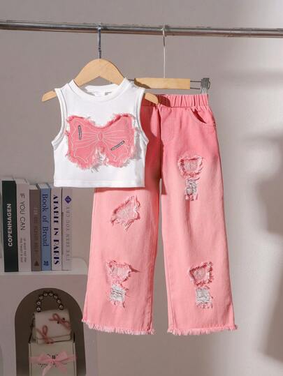 年轻女孩两件套:时尚短款无袖蝴蝶印花背心和做旧蝴蝶刺绣牛仔裤,夏季 - 粉色 - 查看 1