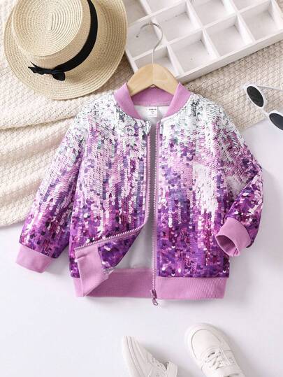 SHEIN 女小童3D亮片效果飛行員夾克 - 紫色 - 查看 1