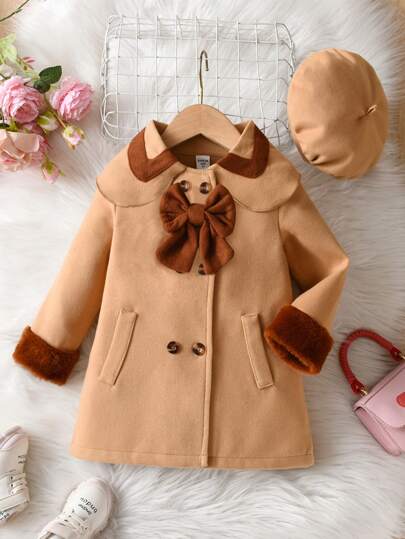 SHEIN 女小童前蝴蝶結雙排釦花呢外套和帽 - 卡其色 - 查看 1