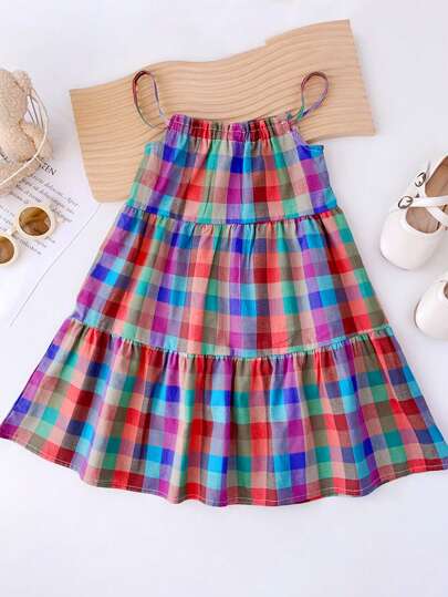 年轻女孩休闲格子印花吊带背心连衣裙,夏季 - 彩色 - 查看 1