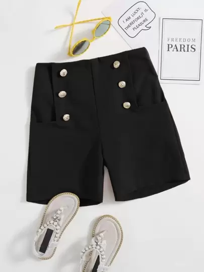 SHEIN 年輕少女雙排扣短褲 - 黑色 - 查看 1