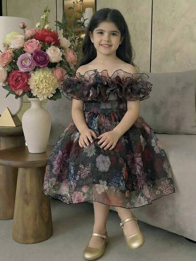 少女优雅多层荷叶边印花中长连衣裙 - 黑色 - 查看 1