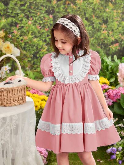 SHEIN Leap Crew 年轻女孩时尚纯色编织蕾丝荷叶边下摆紧身连衣裙 - 粉色 - 查看 1