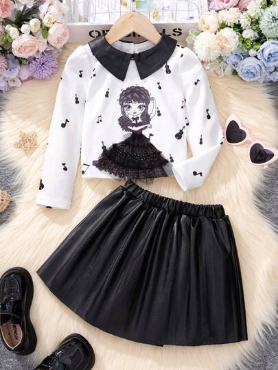 SHEIN 女小童人像圖案拼接領T恤和裙子 - 黑與白 - 查看 1