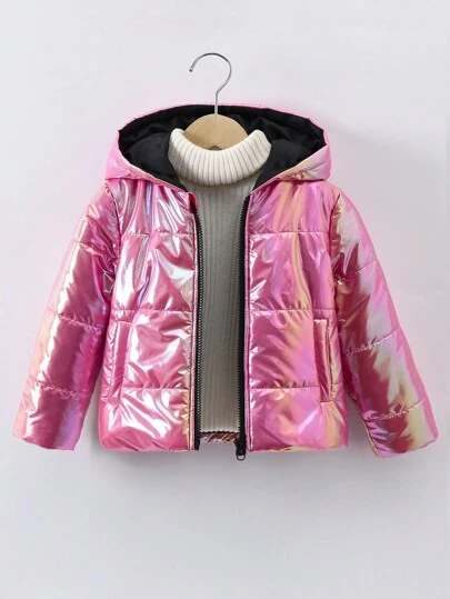 SHEIN 年轻女孩全息连帽棉服外套(不含毛衣) - 玫紅色 - 查看 1