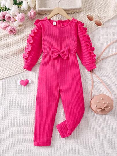 SHEIN 女小童荷葉邊前蝴蝶結插肩袖連身褲 - 玫紅色 - 查看 1