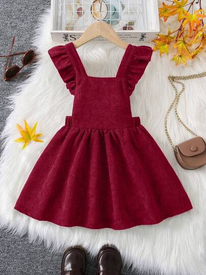 SHEIN 女小童荷葉邊燈芯絨背帶洋裝 - 酒紅色 - 查看 1
