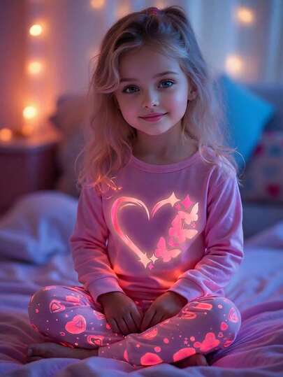 女童春夏针织圆领长袖蝴蝶渐变霓虹图案粉色休闲两件套,时尚紧身睡衣家居服 - 粉色 - 查看 1
