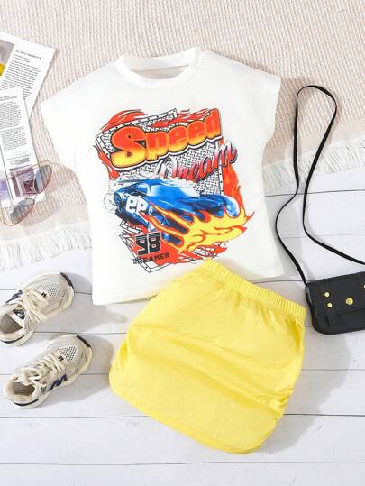 年輕女孩夏季涼爽運動休閒T恤和褶皺裙2件組合套裝 - 黃色 - 查看 1