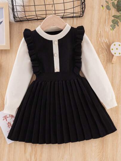 SHEIN 女小童雙色荷葉邊百褶下擺假兩件洋裝 - 黑色 - 查看 1