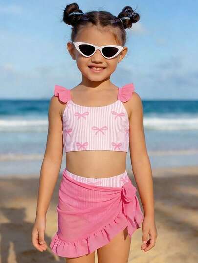 女童三件套比基尼,可爱粉色竖条纹蝴蝶结针织面料肩带纯色荷叶边网纱裙,时尚休闲优雅,适合游泳、夏季度假、海滩、泳池、节日派对 - 粉色 - 查看 1