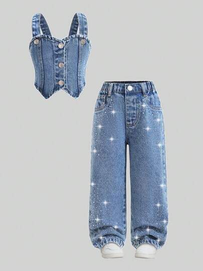 少女牛仔两件套服装 - 中等水洗藍 - 查看 1