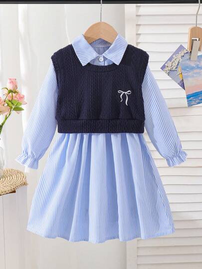 女童校服蝴蝶结刺绣针织背心+条纹长袖翻领衬衫裙两件套 - 藍色 - 查看 1