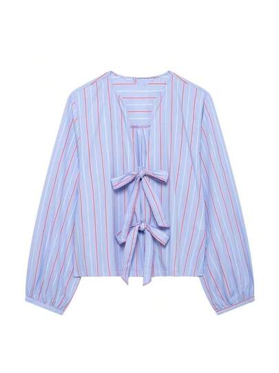 ZEVITY 女士蝴蝶结装饰条纹雪纺衬衫,休闲上衣 LS1415 - 藍色 - 查看 1