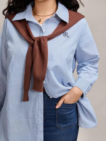 Zelara 大码休闲条纹前扣长袖衬衫